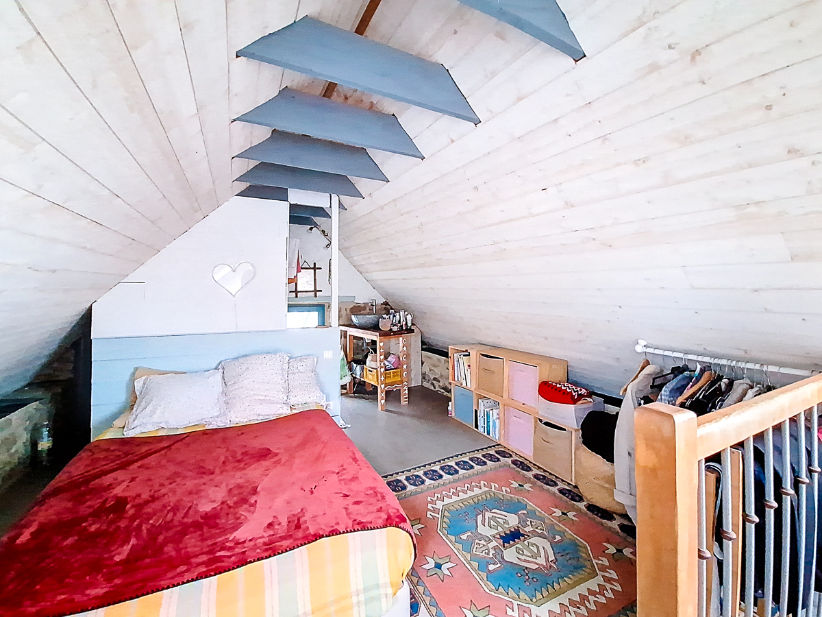 L’étage est composé de deux espaces distincts. Un premier au-dessus de la maison principale, accessible par la pièce de vie, accueille deux belles chambres, une salle de bain, chaque pièce disposant de fenêtres de toit garantissant la vue et la luminosité. Le second se situe au-dessus du bureau et accueille une chambre avec une douche et un lavabo.