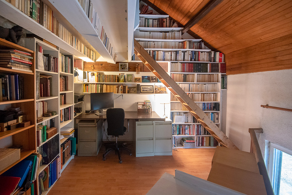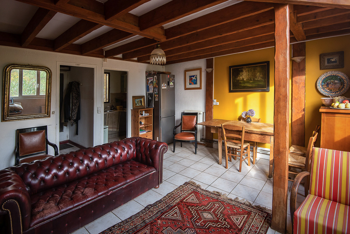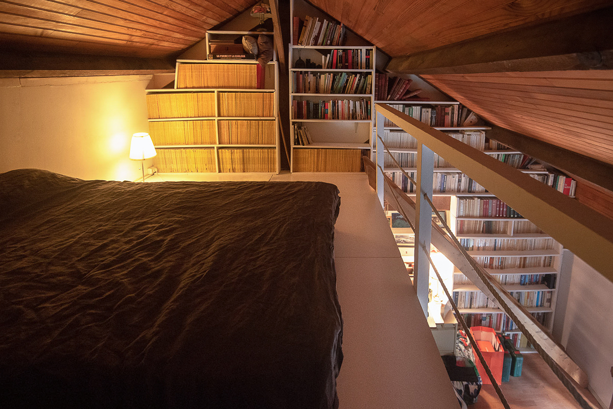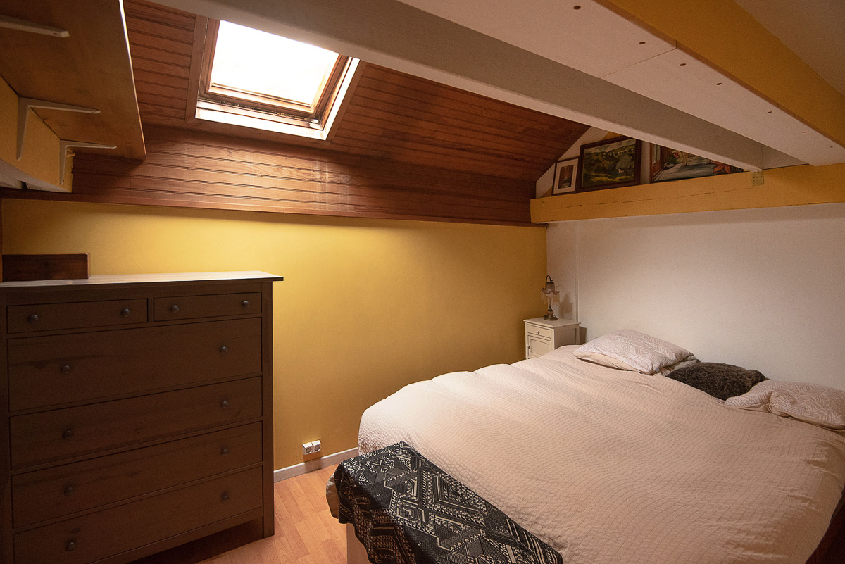 L’escalier mène vers un premier étage accueillant une chambre ainsi qu’une pièce palière aménagée en bureau. Les combles offrent un second couchage.
