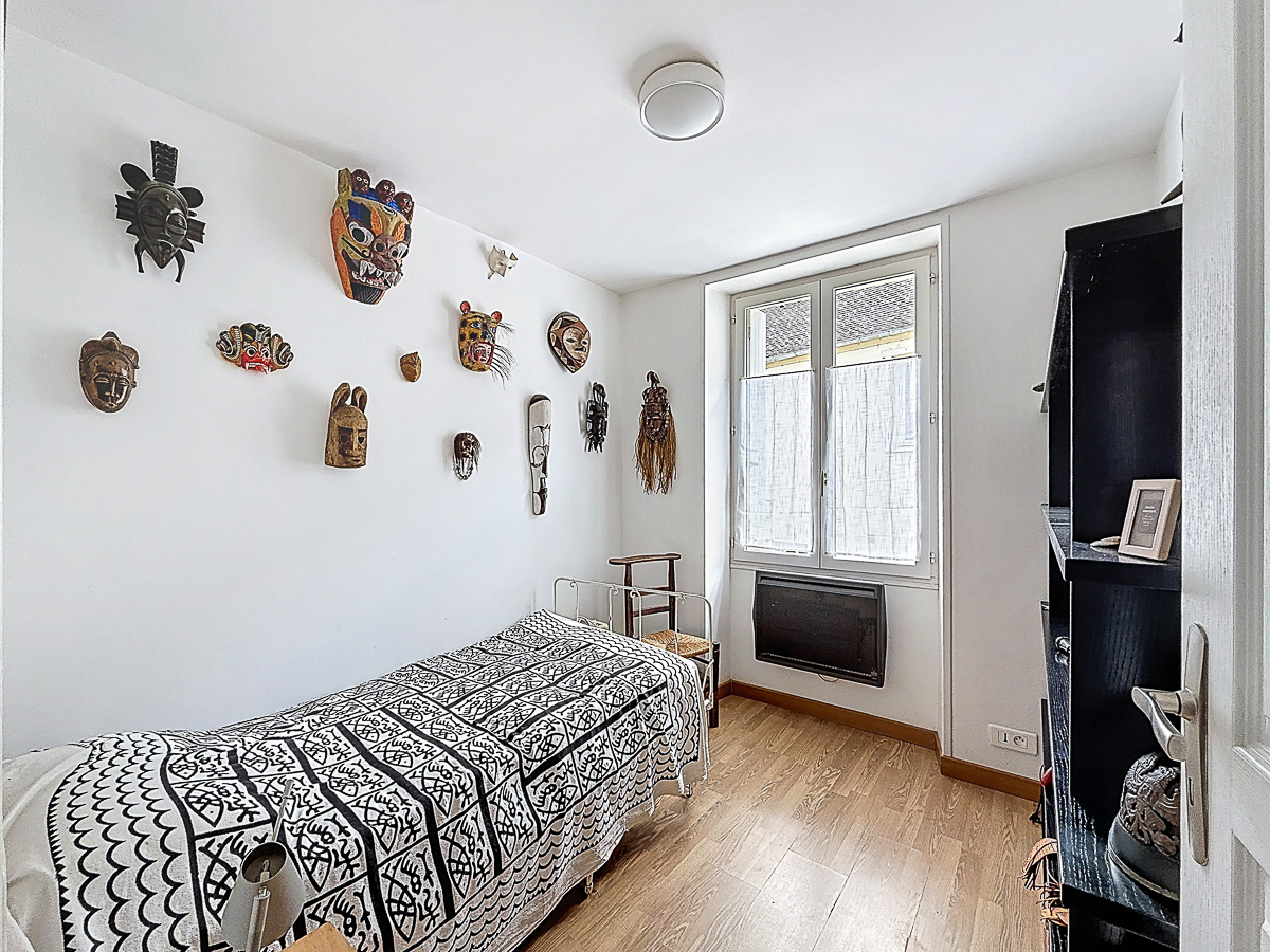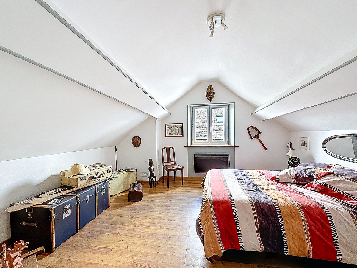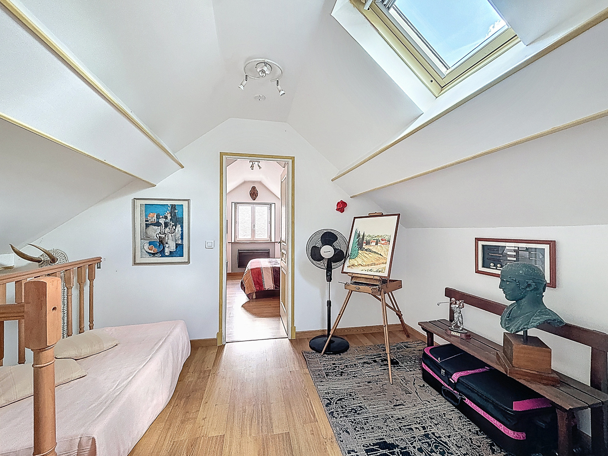 Le premier étage accueille une grande chambre, une salle de bain avec wc et un bureau pouvant faire office de chambre d’enfant.