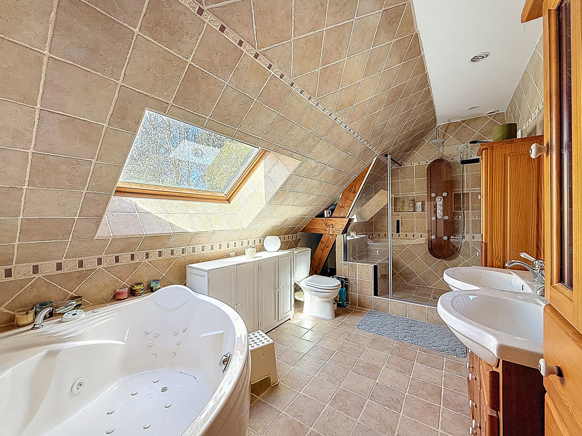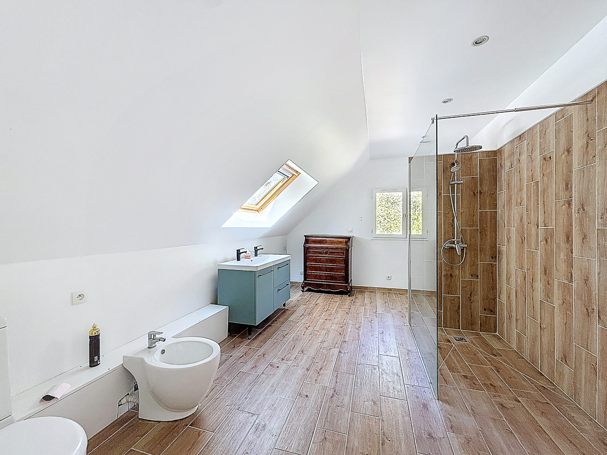 A l’étage, un palier distribue 1 suite de 20 m2 avec dressing et salle de salle de bain (baignoire et douche), 5 autres chambres et deux salles d’eau.