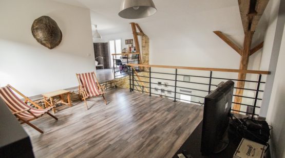 Achevés en 2013, les travaux ont été réalisés sous le contrôle d’un architecte soucieux de valoriser pleinement le potentiel et le cachet qu’offraient cette vieille bâtisse : ainsi sous une hauteur sous plafond de près de 7m, pierre de pays, bois et acier sont mis en valeur par une très grande luminosité.