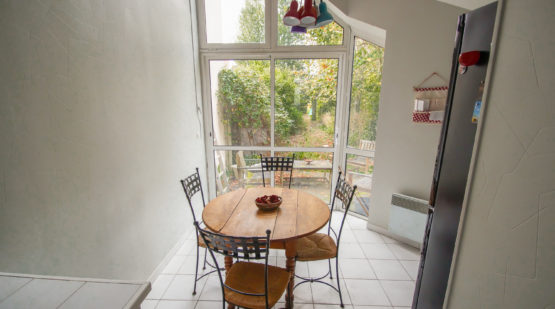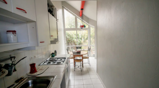 La cuisine, séparée et équipée a fait l’objet d’une extension permettant d’accueillir, sous une belle hauteur sous plafond, un coin repas. La présence d’une vaste baie vitrée, lui octroie une grande luminosité ainsi qu’une vue sur le jardin. Des WC sont disponibles à ce niveau.