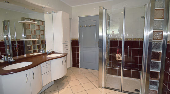 A ce niveau, l’espace nuit comprend 3 belles chambres avec chacune un placard intégré, une salle de bains avec une baignoire d’angle, une grande douche hydromassante, un meuble double-vasques et un WC.
