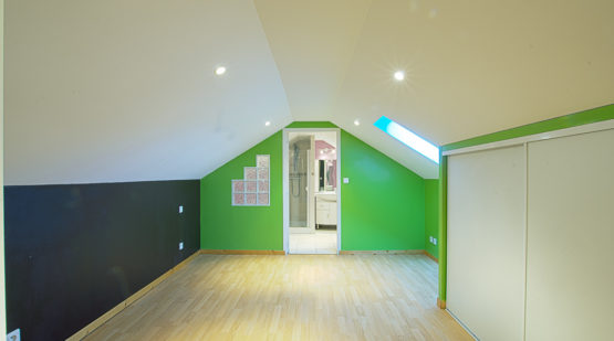 À l’étage, le pallier dessert 2 spacieuses chambres mansardées dont une bénéficiant d’une salle d’eau avec WC. Les deux sont dotées de placards muraux aménagés sur toute leur longueur.